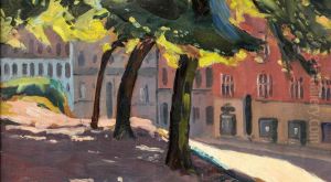 For modern decor, Interior Fra Nyboder’s muted tones and harmonious composition make it ideal for spaces aiming for Scandinavian minimalism or rustic warmth. Hang it in a living room or study where natural light echoes the painting’s glow, ideally in a simple wooden or neutral frame to complement its historic charm. Pair it with linen upholstery, weathered oak furniture, or muted green accents to reinforce its earthy palette. A medium-sized reproduction (around 24x30 inches) would suit above a console table or bookshelf, creating a focal point without overwhelming smaller rooms. In offices, it adds quiet sophistication—layer it with black-and-white sketches or vintage maps for a curated, intellectual vibe. The key is to let its serene energy anchor the space.