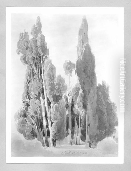 Ernst Fries' Zypressen im Tivoli (1838) transports viewers to the sun-dappled gardens of the Villa d'Este near Rome, where slender cypress trees stretch toward an azure sky. A masterwork of German Romanticism, the painting blends meticulous botanical detail with an atmospheric, almost poetic sensibility—capturing the interplay of light, shadow, and Mediterranean foliage. Fries, a Heidelberg-born artist, was deeply influenced by his Italian travels, and this work exemplifies his skill in merging Northern European precision with Southern luminosity. Historically, it reflects the 19th-century fascination with Italy as an artistic paradise, bridging the traditions of plein-air sketching and idealized landscape painting. Today, it stands as a testament to Fries’ overlooked yet vital role in Romantic landscape art, offering a quieter counterpart to the drama of Caspar David Friedrich.