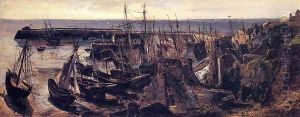 Theodore Rousseau’s The Jetty at the Port of Granville is a serene yet evocative landscape that captures the quiet drama of coastal life in mid-19th century France. Painted around 1843, the work exemplifies Rousseau’s mastery of the Barbizon School’s naturalistic approach, emphasizing moody skies, textured brushwork, and a harmonious interplay of light and shadow. The composition centers on a rugged stone jetty extending into the choppy waters, flanked by fishing boats and dotted with laborers—a testament to Rousseau’s fascination with rural authenticity. Unlike the idealized landscapes of his predecessors, Rousseau’s work embraced raw, unembellished nature, foreshadowing Impressionism’s later break from tradition. Historically, this piece reflects the Barbizon School’s pivotal role in transitioning from Romanticism to Realism, cementing Rousseau’s reputation as a pioneer of plein air painting. Its atmospheric depth and subdued palette evoke a sense of quiet resilience, making it a timeless meditation on humanity’s relationship with the sea.