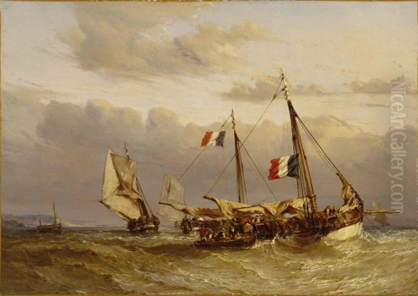 Eugène Isabey’s Fishing Boat (circa 1850s) is a striking example of Romantic marine painting, blending drama and naturalism with masterful brushwork. The scene captures a lone fishing vessel braving turbulent seas, skies heavy with brooding clouds that mirror the choppy waves below. Isabey’s loose, expressive strokes imbue the scene with movement and emotion, a hallmark of the Romantic era’s fascination with nature’s sublime power. The mood is both heroic and melancholic—the small boat, dwarfed by the vast sea, becomes a poignant symbol of human resilience. As a pivotal figure bridging Neoclassicism and Romanticism, Isabey influenced later plein-air painters. His maritime works, including this one, are celebrated for their atmospheric depth and dynamic compositions, positioning him as a key link between French Romanticism and Impressionist seascapes.