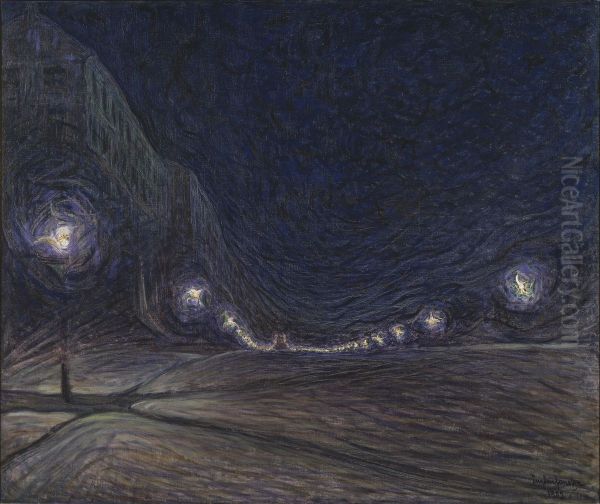 Eugene Jansson’s Hornsgatan by Night (1899) is a mesmerizing nocturne that captures Stockholm bathed in an ethereal blue glow. The painting’s dreamlike atmosphere, dominated by cool luminescent tones, transforms the urban scene into a poetic reverie. Jansson, a pivotal figure in Swedish Symbolism, abandoned detailed realism for expressive brushwork and mood-driven color—here, the streetlights blur into the twilight, creating a sense of quiet solitude. This work marks his transition from melancholy figurations to his later, more celebrated "Blue Paintings" series, where nocturnal cities became his signature theme. Historically, Hornsgatan by Night exemplifies the Nordic fin-de-siècle tension between modernity and introspection, bridging Romantic emotionality and early Modernist abstraction. Its haunting beauty has cemented Jansson’s status as Sweden’s preeminent painter of twilight moods.