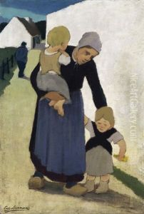 Eugène Laermans' Moeder En Kinderen - Mère Et Enfants (Mother and Children) is a poignant depiction of maternal love and familial bonds, rendered in the artist's signature somber yet expressive style. Created in the late 19th or early 20th century, the work reflects Laermans' deep empathy for the working class, often portraying their struggles with raw emotional intensity. The muted, earthy palette and heavy brushstrokes evoke a sense of melancholy and quiet resilience, characteristic of Belgian Social Realism. Figures are typically elongated and stooped, emphasizing the weight of their daily burdens. Laermans, though less internationally renowned than his contemporaries like Ensor or Spilliaert, holds a significant place in Belgian art history for his unflinching portrayal of human dignity amid hardship. The painting's emotional depth and masterful composition make it a compelling study of universal themes of care and endurance.