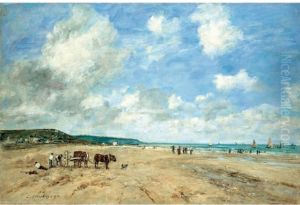 Eugène Louis Boudin's Deauville Harbour (c. 1880s) captures the luminous essence of Normandy’s coastal life with a masterful play of light and atmosphere. Known as the "king of skies," Boudin employs loose, expressive brushstrokes—characteristic of his proto-Impressionist style—to depict the bustling harbor under a vast, cloud-dappled sky. The painting showcases his signature focus on transient weather effects, with reflections shimmering on the water and sails billowing in the breeze. As a pivotal figure who influenced Monet, Boudin’s work bridges Romanticism and Impressionism, celebrated for its plein-air spontaneity and nuanced tonal harmonies. Deauville Harbour exemplifies his ability to elevate maritime scenes into poetic studies of light, cementing his legacy as a precursor to modern landscape painting.