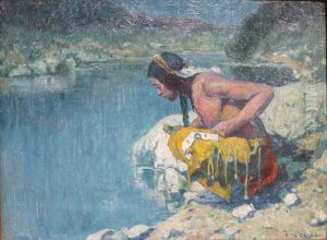 Everett Shinn's Girl on Stage (c. 1906–1910) epitomizes the vibrant energy of early 20th-century urban entertainment through its dynamic brushwork and theatrical subject matter. A leading figure of the Ashcan School, Shinn captured the fleeting moments of vaudeville performers with a keen sense of movement and dramatic lighting. The painting depicts a young dancer mid-performance, her figure illuminated against the dusky backdrop of the stage, her delicate posture contrasting with the raw energy of the scene. Shinn’s loose, impressionistic strokes and warm, artificial lighting evoke the immediacy of live theater, while his focus on working-class entertainers reflects the Ashcan School’s commitment to realism and modern urban life. This piece stands as a significant work within American art history, bridging the gap between realist observation and the emerging modernist fascination with urban spectacle.