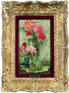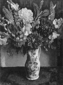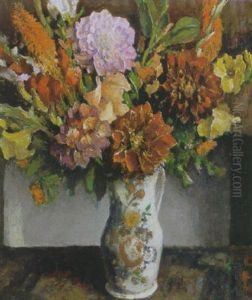 Blumenstilleben Mit Dahlien Und Nelken In Zwei Glasvasen Auf Einem Tisch