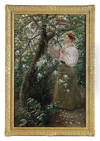 Fanny Brate’s I Trädgården - Fru Magnhild Croelius (1902) is a vibrant portrayal of domestic serenity and Nordic light. The painting depicts the artist’s elderly aunt seated in a sun-dappled garden, surrounded by lush greenery and delicate floral patterns that adorn her dress and the surroundings. Brate’s brushwork blends realism with impressionistic touches, capturing the interplay of light and shadow with a delicate, almost luminous quality. As a leading figure in Swedish genre painting, Brate’s work reflects the late 19th-century romanticization of rural life and feminine domesticity, while her attention to textiles and botanicals nods to the Arts and Crafts movement. This piece stands as a testament to her ability to elevate everyday moments into poetic vignettes, securing her place in Scandinavian art history as a skilled observer of quiet beauty and refined detail.