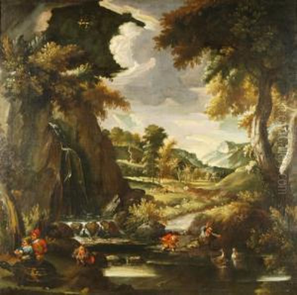 "gnomi E Folletti In Un Paesaggio Con Ruscello" Olio Su Tela