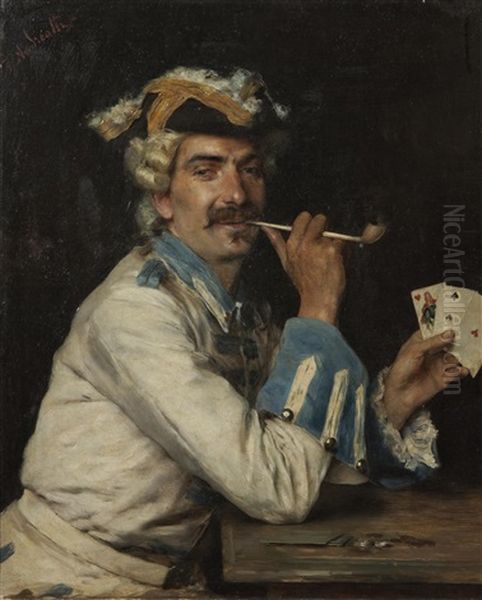 The painting Le Joueur De Cartes by Federico Andreotti (1847–1930) captivates viewers with its warm, intimate depiction of 19th-century leisure. Set against a rustic interior bathed in soft golden light, the artwork portrays a gentleman absorbed in a card game, his poised demeanor and richly textured attire exuding elegance. Andreotti, trained in Florence and influenced by Italian genre painting, masterfully blends realism with narrative charm, subtly evoking the leisurely pursuits of European aristocracy. His meticulous attention to detail—seen in the folds of fabrics and interplay of light—places him among the refined academic painters of his era. Though less widely celebrated than contemporaries like Boldini, Andreotti’s works remain prized for their historical authenticity and quiet sophistication, offering a window into the genteel pastimes of the late 1800s.