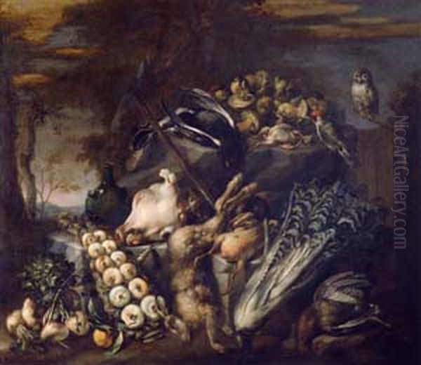 Dispensa con ortaggi, funghi, selvaggina, testa di vitello e civetta
