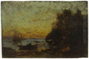 Barque et voiliers, couche de soleil. Au revers : Marine