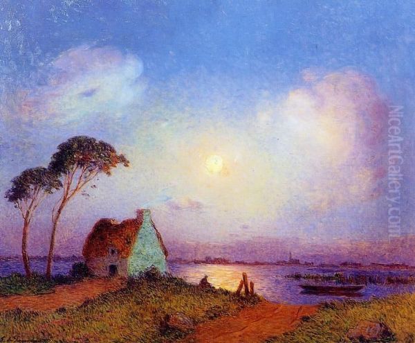 Ferdinand du Puigaudeau’s Grande Brière Landscape captures the mystical allure of the marshy Breton region under the soft glow of twilight. With his signature Post-Impressionist style, the artist translates the quiet drama of nature through expressive brushstrokes and a rich palette of muted blues, golden yellows, and earthy greens. The scene, likely inspired by the Brière marshes near his home, radiates a dreamlike tranquility, where reflections on the water merge with the dusky sky. A lesser-known but pivotal figure in the Pont-Aven School, Puigaudeau’s work bridges Impressionism’s spontaneity and Symbolism’s emotional depth. Though overshadowed by contemporaries like Gauguin, his ability to evoke atmosphere and regional identity cements his place in late 19th-century French art history.