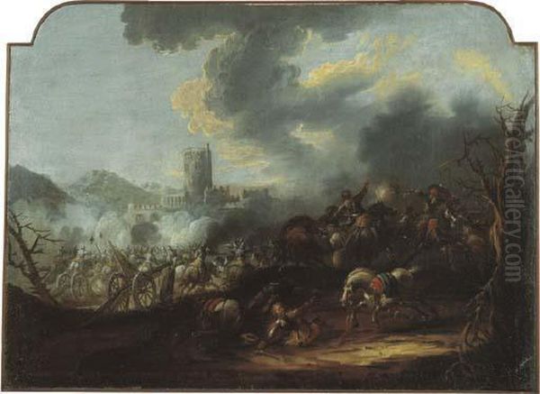 Scontro Di Cavalleria Con Borgo Turrito In Lontananza