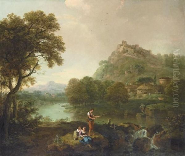 An Extensive River Landscape With A Fisherman And His Family On The Bank Above A Cascade, A Thatched Villa And A Hilltop Fortress Beyond