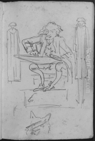 Sittande tecknare samt tva andra mansfigurer. Ingar i skissbok om 46 blad