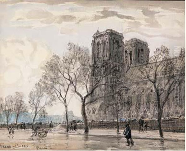 Frank Myers Boggs' Paris, Notre-Dame Au Quai De La Tournelle captures the timeless charm of Paris with a masterful interplay of light and atmosphere. Painted in the late 19th or early 20th century, this impressionistic work depicts Notre-Dame Cathedral as seen from the Quai de la Tournelle, rendered in Boggs' signature style that blends realism with a soft, atmospheric touch. The scene exudes a serene, almost poetic quality—misty skies meld with the Seine’s reflections, while the Gothic spires of Notre-Dame rise gracefully in the distance. Boggs, an American artist who found inspiration in France, was part of the broader Impressionist movement, though his works often leaned toward a more muted tonal palette compared to his French counterparts. This piece exemplifies his skill in capturing urban landscapes with emotional depth, making it a notable example of transatlantic Impressionism and a valuable artifact of Parisian iconography in art history.