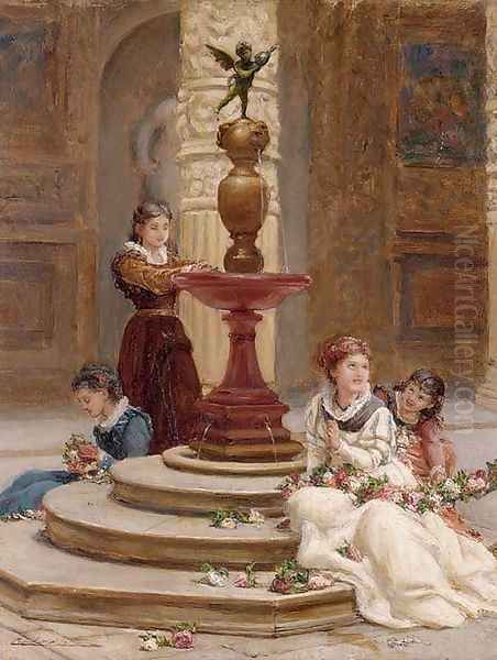 Frank William Warwick Topham’s Girls Making Flower Garlands beside a Fountain is a charming Victorian-era painting that exudes innocence and pastoral serenity. Created during the 19th century, the artwork depicts young girls in delicate dresses gathered by a classical fountain, weaving flowers into garlands—a theme reflecting the Romantic era’s fascination with childhood purity and nature’s idyllic beauty. Topham, a British painter influenced by Pre-Raphaelite aesthetics, employs soft yet luminous colors and meticulous attention to fabric textures and floral details, evoking a dreamlike, almost timeless quality. Though not as widely recognized as his contemporaries, Topham’s work captures the era’s sentimental narratives and technical refinement, making it a subtle gem within Victorian genre painting. The composition’s harmony and gentle light invite viewers into a tranquil, romanticized moment, offering respite from modernity.