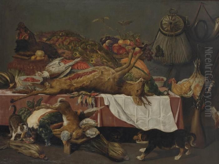 Frans Snyders' A Roebuck, A Peacock, A Boar’s Head, Hare, A Partridge And Other Birds With Apples, Apricots, Grapes And Other Fruit In A Basket And Berries In Bowls, All On A Draped Table With Two Dogs And Two Cats And Hunting Paraphernalia is a breathtaking Baroque still-life that pulsates with vitality and opulence. Painted circa the early 17th century, Snyders—a Flemish master renowned for his lavish depictions of game and flora—creates a sumptuous tableau teeming with texture and movement. The composition bursts with contrasts: the sleek feathers of the peacock against the rough hide of the boar, glistening fruits nestled beside lifeless game, and the alert tension of hunting dogs juxtaposed with domestic cats. Snyders' virtuosic handling of light amplifies the richness of each element, a hallmark of his collaboration with Rubens, reflecting Antwerp's golden age of still-life painting. This work exemplifies the pronkstilleven (ostentatious still-life) tradition, celebrating abundance while subtly hinting at mortality—a vanitas theme cloaked in sensory delight. Its historical significance lies in elevating game still-lifes to grand narratives, influencing later artists like Jan Fyt.