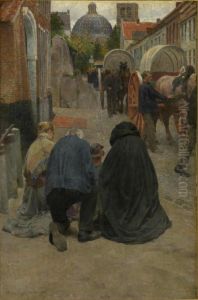 Feldweg Mit Jungen Bauern Auf Einem Pferdefuhrwerk, Im Hintergrund Zwei Bauernmagde