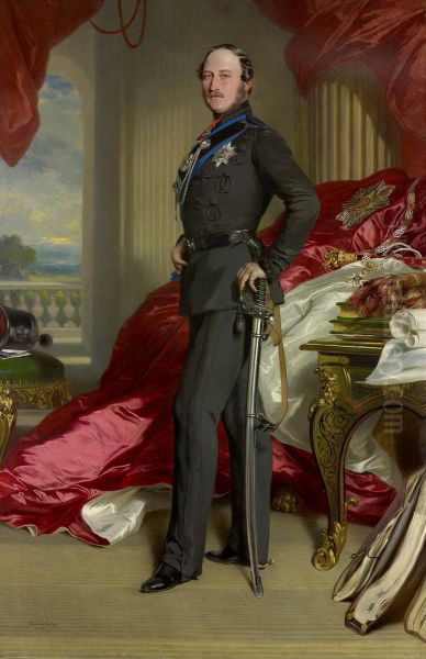 For contemporary interiors, this masterpiece commands a space where its grandeur and intimacy can harmonize. Ideal above a mantelpiece or in a study, the painting’s regal scale (typical of Winterhalter’s full-length portraits) suits high ceilings and classical moldings. Ground the composition with deep-toned furniture—mahogany bookshelves or a Chesterfield sofa—to mirror its rich colors while allowing the artwork to dominate. Complement the palette with jewel tones: emerald velvets or sapphire ceramics echo Albert’s sash and sky background. In minimalist settings, frame it in an ornate gold leaf frame to amplify its historic allure; for modern offices, pair it with sleek metallic accents for contrast. Avoid cluttering nearby walls—let Winterhalter’s artistry resonate as a focal point, balancing tradition and timeless sophistication.