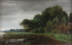 Frederik Christian Jacobsen Kiaerskou’s Uvejr I Nordsjaelland (Storm in North Zealand) is a striking 19th-century Danish landscape painting that captures the raw power of nature with remarkable emotional depth. The scene depicts a tempestuous sky looming over the rolling countryside of North Zealand, where jagged bolts of lightning illuminate the darkened horizon, contrasting with the muted greens and earthy tones of the terrain below. Painted in a Romantic tradition, Kiaerskou’s work reflects the era’s fascination with nature’s sublime forces—dramatic, untamed, and awe-inspiring. His brushwork combines realism with expressive intensity, a hallmark of Danish Golden Age painting, though his focus on atmospheric effects also hints at the emerging influence of Impressionism. While less internationally renowned than contemporaries like Christoffer Wilhelm Eckersberg, Kiaerskou’s contributions to Danish landscape art remain significant, particularly for his ability to evoke mood and movement through skilled composition and light play.