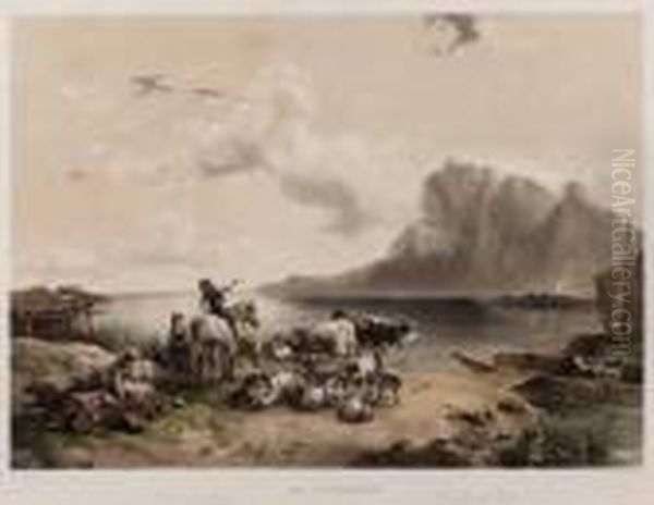 Friedrich Gauermann’s Am Attersee kolorierte Lithografie captures the serene beauty of Austria’s Lake Atterseelandscape with remarkable warmth and atmosphere. The richly colored lithograph showcases Gauermann’s masterful blend of Biedermeier romanticism and naturalistic precision, depicting tranquil waters surrounded by lush greenery and distant Alpine foothills bathed in soft light. Created during the mid-19th century, a period when lithography flourished as a medium for democratizing art, this work reflects Gauermann’s dual legacy as both a painter and printmaker celebrated for his pastoral scenes. Unlike his oil paintings, the lithograph retains an intimate charm through its delicate hand-coloring—a testament to the artist’s keen eye for tonal harmony. Within Austrian art history, Gauermann bridges the gap between idealized landscape traditions and emerging realism, making Am Attersee a poignant example of how 19th-century artists romanticized nature while honoring its authenticity.