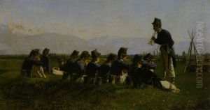 The painting Alte Kameraden by Friedrich V. Malheim Friedlaender is a captivating military genre scene that exudes camaraderie and nostalgia. Painted in the late 19th or early 20th century, the work depicts a group of retired or off-duty soldiers sharing a moment of jovial companionship, likely reminiscing about past campaigns. Friedlaender's style reflects the realism and attention to detail characteristic of academic art during this period, with finely rendered facial expressions and textures that bring the figures to life. The warm, earthy tones and soft lighting enhance the sense of intimacy and mellow nostalgia. While not as widely recognized as some of his contemporaries, Friedlaender's works hold a distinct place in military genre painting, offering insight into the social dynamics and sentimental ideals of soldiers' lives beyond the battlefield.