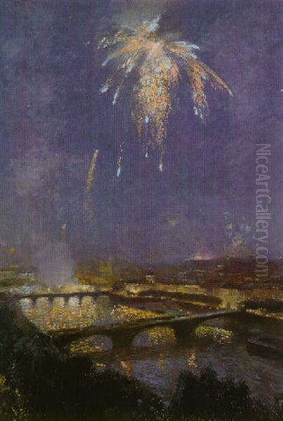 Gaston La Touche’s Feu D'artifice Sur Paris (Fireworks Over Paris) is a mesmerizing celebration of light and movement, capturing the magic of fireworks illuminating the Parisian sky. Painted in the late 19th or early 20th century, this work exemplifies La Touche’s signature Impressionist style, infused with a dreamlike, almost poetic quality. The scene bursts with radiant colors—gold, sapphire, and crimson—exploding against a dusky backdrop, reflecting off the Seine and the city’s iconic architecture. La Touche, though less renowned than Monet or Renoir, was a master of atmospheric effects, and this piece highlights his ability to blend realism with enchantment. Within art history, it represents the Belle Époque’s optimism and the era’s fascination with urban spectacle, bridging Impressionism and Symbolism. The painting’s lyrical yet dynamic composition makes it a standout in La Touche’s oeuvre, offering a timeless glimpse into Paris’s luminous nights.