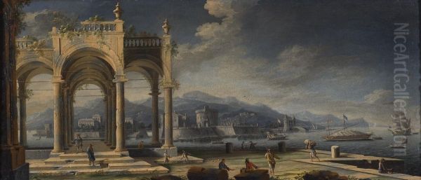 Gennaro Greco's Capriccio of Ancient Ruins at a Mediterranean Port with Boats and Bystanders transports viewers to an enchanting, dreamlike coastal scene. The painting masterfully blends classical ruins with vibrant harbor life, bathed in warm Mediterranean light that casts golden hues across crumbling columns and tranquil waters. A celebrated example of 18th-century capriccio—a genre combining real and imaginary architecture—Greco's work reveals his fascination with antiquity while infusing Baroque dynamism through the play of light and intricate details. Sailboats bob gently near weathered stone arches, while small figures animate the foreground, adding narrative charm. As a Neapolitan artist, Greco contributed significantly to the veduta (view painting) tradition, though his imaginative reconstructions distinguish him from purely topographical painters. This piece exemplifies why capricci were prized by Grand Tour collectors—blending poetic nostalgia with technical precision to create timeless escapism.