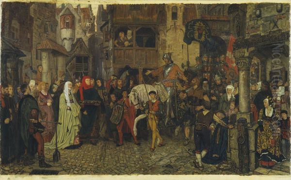The Entry of Sten Sture the Elder into Stockholm by Swedish artist Georg von Rosen (1843–1923) is a striking historical tableau that captures a pivotal moment in Scandinavian history with dramatic intensity. Painted in the Romantic tradition with meticulous attention to historical detail, the work depicts the triumphant 1471 arrival of Swedish regent Sten Sture after defeating Danish forces at the Battle of Brunkeberg. Von Rosen masterfully contrasts the somber procession's grandeur against Stockholm's medieval architecture, using chiaroscuro lighting to heighten emotional tension. The painting exemplifies 19th-century National Romanticism, a movement that sought to revive Nordic cultural identity through idealized historical scenes. As one of Sweden's most significant history paintings, it occupies an important place in the Nordic art canon, blending academic precision with nationalist sentiment while showcasing von Rosen's expertise in costume archeology and architectural rendering.