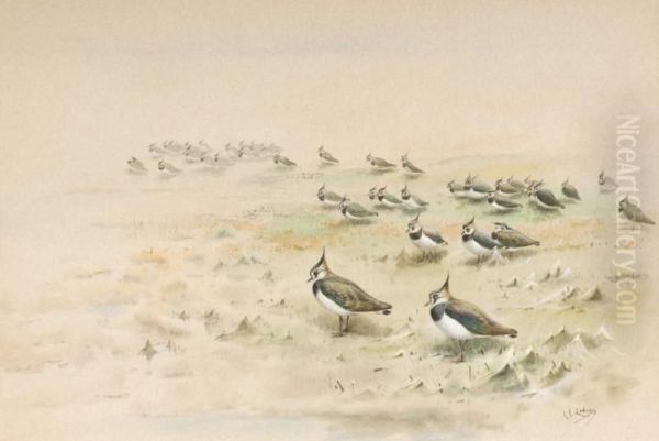 George Edward Lodge’s Lapwings By The Lochside is a captivating study of nature’s quiet drama. Painted with precision and admiration for wildlife, it depicts lapwings—a species of wading birds—gathered near a loch, their iridescent plumage shimmering against the soft hues of the water and sky. Lodge, a renowned British artist and ornithologist (1860–1954), was celebrated for his meticulous attention to avian anatomy and behavior, bridging scientific accuracy with artistic elegance. The work exemplifies the Naturalist tradition of the late 19th and early 20th centuries, where realism and detail were paramount. Though less famous than contemporaries like Audubon, Lodge’s contributions to wildlife art remain significant, particularly for their lifelike dynamism. The painting’s subdued yet luminous palette evokes the misty tranquility of the Scottish Highlands, offering viewers a serene yet vivid glimpse into the wild.