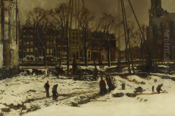 In George Hendrik Breitner’s "Doorbraak van de Raadhuisstraat in de winter-Laying of the Raadhuisstraat," the artist masterfully captures the raw energy of urban transformation in 19th-century Amsterdam. The painting immerses viewers in a misty winter scene, where workers toil amidst the muddy chaos of construction, their silhouettes blurred by the cold, damp air. Breitner’s loose, impressionistic brushstrokes and muted palette—dominated by grays, browns, and icy blues—evoke both the grit and fleeting beauty of modernization. As a leading figure of the Amsterdam Impressionism movement, Breitner documented the city’s rapid changes with a bold, almost photographic realism, blending everyday life with a sense of atmospheric drama. This work is celebrated not just for its historical documentation but also for its innovative approach to light and movement, solidifying Breitner’s legacy as a pioneer of Dutch urban realism.
