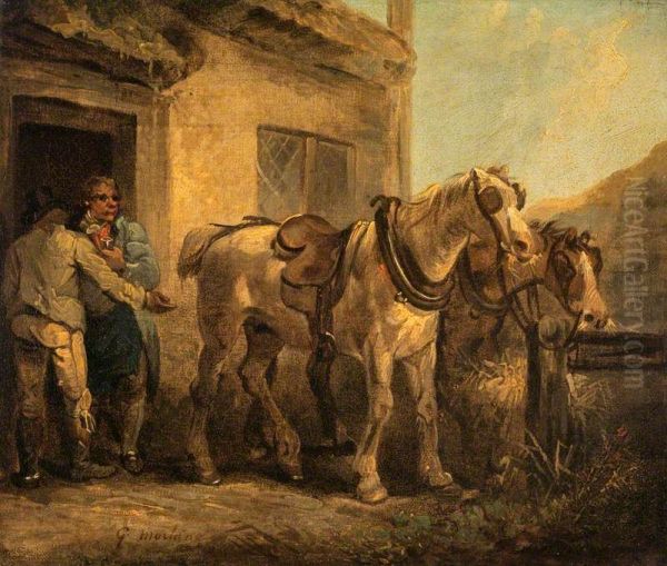 The Stable Door by George Morland (1763–1804) is a quintessential example of late 18th-century British genre painting, capturing rustic life with warmth and authenticity. This charming oil-on-canvas scene depicts a weathered stable door framing a tranquil moment—often featuring horses, farmhands, or children in sun-dappled pastoral simplicity. Morland’s loose brushwork and naturalistic lighting reflect Dutch Golden Age influences, yet his focus on rural English subjects made him a bridge between Hogarth’s narrative realism and Constable’s Romantic landscapes. Though less celebrated than his contemporary Gainsborough, Morland’s work gained popular acclaim for its sentimental yet unsentimentalized portrayal of country life. The Stable Door exemplifies his ability to elevate everyday vignettes into poetic compositions, securing his niche in art history as a chronicler of pre-industrial rural idylls.