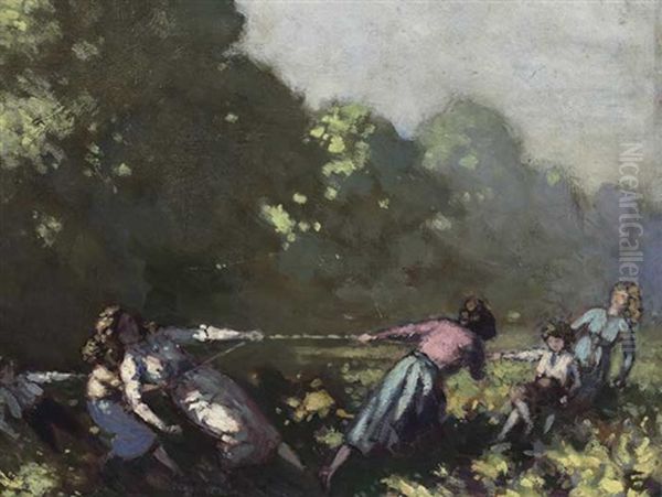 George William Russell’s A Game of Tug-o-war is a mesmerizing blend of mystic symbolism and pastoral charm, characteristic of the Irish Revival movement. Bathed in soft, dreamlike hues, the painting captures children engaged in a tug-of-war amidst an ethereal landscape, evoking a timeless, almost mythological quality. Russell, a poet-painter deeply influenced by Theosophy and Celtic spirituality, infuses the scene with a sense of unity between humanity and nature—a hallmark of his work. Painted in the early 20th century, the piece reflects the Symbolist fascination with emotion and idealism, diverging from the rigid realism of its time. Though less known than his literary contributions, Russell’s art occupies a unique niche in Irish art history, bridging Romanticism and modernist abstraction with its lyrical, introspective tone.