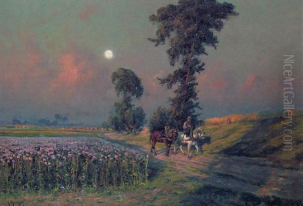 Georges-Philibert-Charles Maroniez's Les Oeillettes is a captivating example of late 19th-century naturalist painting, radiating pastoral tranquility. The work depicts a sun-drenched field of corn poppies (oeillettes), their delicate crimson petals swaying against a soft, luminous sky—a hallmark of Maroniez’s dedication to plein air techniques and botanical accuracy. Born in 1865, Maroniez was deeply influenced by the Barbizon School and Impressionism, blending meticulous detail with atmospheric light effects. Though lesser-known than Monet’s floral studies, Les Oeillettes embodies a quiet yet significant contribution to rural genre painting, celebrating the harmony between cultivated land and wild flora. Its subdued palette and balanced composition reflect the era’s shift toward intimate, nature-inspired narratives, positioning it as a bridge between realism and early modernism.