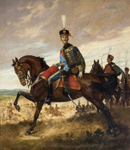 For display, this portrait commands attention best in a traditional or neoclassical setting—think wood-paneled studies, grand libraries, or executive offices with dark-toned furnishings. Its regal blues and golds pair elegantly with deep burgundy or navy walls, while a gilded frame would heighten its opulence. Given its likely imposing size (typical of royal portraits), ensure ample wall space and balanced lighting—avoid direct sunlight to preserve the hues. In a modern space, juxtapose it with minimalist furniture to let the painting’s grandeur shine. For thematic cohesion, flank it with militaria or antique books, or soften its formality by placing it near lush green plants. Whether as a focal point in a formal seating area or a statement piece behind a desk, this portrait elevates any space with historical gravitas.
