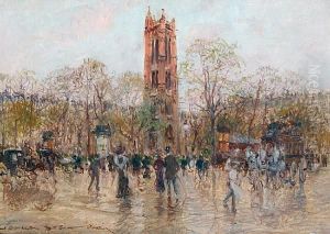 Georges Stein's La Tour St Jacques captures the timeless elegance of Paris' iconic Flamboyant Gothic tower shrouded in misty ambiance. Painted circa late 19th century during the Post-Impressionist period, Stein masterfully balances architectural precision with atmospheric depth—soft brushstrokes dissolve limestone details into a pearly dawn light, while the foreground’s cobblestones reflect rain-kissed luminosity. This work exemplifies Stein’s hybrid style: combining academic draftsmanship with proto-modern moodiness, bridging Realism and Symbolism. Historically significant, it reflects Parisians’ fascination with medieval heritage during urbanization under Haussmann, making it a poignant cultural artifact beyond mere cityscape. Its subtle chromatic gradations and poetic stillness align with contemporaries like Eugène Galien-Laloue, yet Stein’s singular focus on solitary monuments carves a niche in fin-de-siècle urban landscapes.