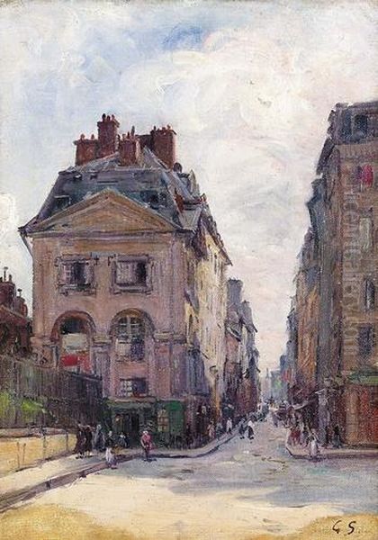 Georges Stein's Rue des Victoires, Paris captures the elegant charm of one of the city’s most iconic streets with remarkable precision. The artwork belongs to Stein’s celebrated series of Parisian cityscapes, painted in the late 19th to early 20th century, when he mastered the interplay of light and architectural detail in the realist-impressionist style. The scene unfolds with Haussmannian buildings framing the bustling street, their wrought-iron balconies and creamy facades bathed in soft sunlight, while pedestrians and carriages add lively movement. Stein’s brushwork preserves the vibrancy of Parisian life while paying homage to its grand urban redesign—an artistic testament to the Belle Époque’s optimism. His works bridge academic precision and atmospheric spontaneity, positioning him alongside contemporaries like Jean Béraud yet with a distinctive sensitivity to intimate urban moments. Rue des Victoires, Paris stands as both a historical document and an artistic jewel, embodying Stein’s legacy in chronicling Paris’s golden age.