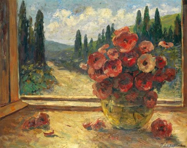 Georgi Alexandrovich Lapchine's Bouquet De Fleurs Devant La Fenetre (Bouquet of Flowers Before the Window) is a radiant celebration of color and light, embodying the lyricism of post-impressionism with a distinctly Russian sensibility. Painted in the early 20th century, this work captures a vibrant bouquet against a sunlit window, where loose, expressive brushstrokes dissolve the boundaries between interior and exterior spaces. Lapchine, a lesser-known but skilled Russian-French artist, bridges academic precision and modern exuberance—his flowers pulse with life, while the play of light recalls Bonnard’s intimate interiors. Though not revolutionary in art history, the painting exemplifies the transnational dialogue of the era, blending Parisian avant-garde influences with Lapchine’s native decorative traditions. Its joyful luminosity and tactile brushwork offer a testament to the enduring appeal of still-life as a medium for emotional resonance and formal experimentation.