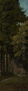 Buitenzijde van de rechtervleugel van een drieluik met een bosgezicht