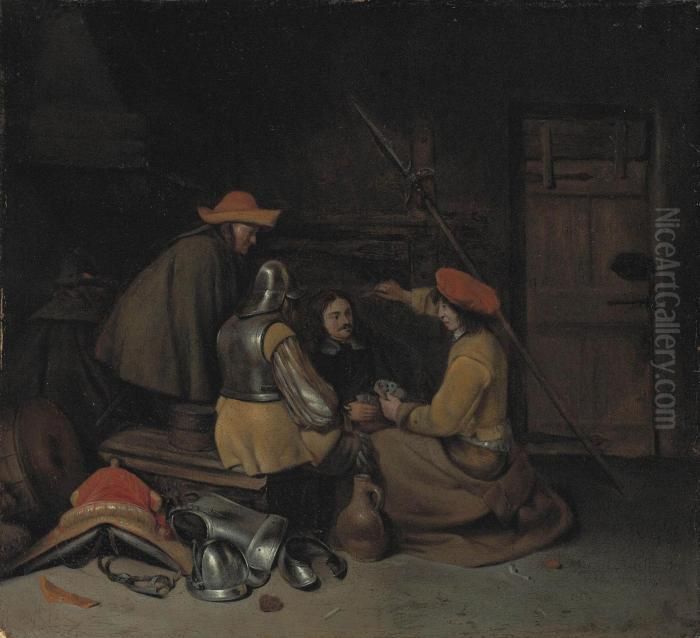 Bring the timeless beauty of Gerard Terborch's Soldiers Playing Cards In An Interior into your home with a handmade oil painting reproduction. Carefully recreated on canvas by skilled artists using traditional techniques, this piece captures the delicate brushwork, subtle light, and vibrant color of the original masterpiece. With museum-level quality and rich texture, it brings elegance and artistic depth to any space. Enjoy free shipping and make this masterpiece a part of your personal collection.