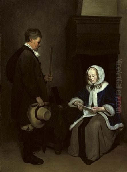 Gerard Ter Borch’s An Elegant Lady Reading A Letter With A Man Standing By (c. 1660) epitomizes the refined intimacy of Dutch Golden Age genre painting. The scene captures a quiet, private moment—a lavishly dressed woman absorbed in reading a letter while a gentleman hovers nearby, his expression suggesting curiosity or concern. Ter Borch’s mastery lies in his meticulous rendering of textures: the shimmering satin of the lady’s gown, the subtle play of light on her lace collar, and the restrained yet expressive body language of the figures. The muted, earthy palette and restrained composition heighten the sense of quiet tension, inviting viewers to ponder the unspoken narrative. As a leading figure of the fijnschilders ("fine painters") movement, Ter Borch excelled in small-scale domestic scenes that balanced psychological depth with exquisite detail. This work exemplifies his influence on later artists like Vermeer, cementing its status as a masterpiece of 17th-century Dutch realism.