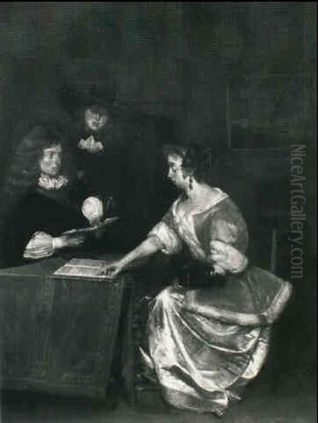 Step into the luminous world of Gerard ter Borch's An Elegant Musical Gathering (c. 1675), where soft candlelight caresses the velvety textures of sumptuous fabrics and animated faces glow with refined merriment. This exquisite Dutch Golden Age masterpiece showcases Ter Borch's unparalleled skill in rendering the tactile qualities of satin, silk, and lace while capturing fleeting social dynamics among the elite. The composition arranges figures around a central musical performance – a popular genteel pastime – their restrained gestures and subtle glances revealing complex interpersonal narratives beneath the polished surface. Ter Borch's restrained color palette of silvery grays, creams, and rich blacks demonstrates his mastery of tonal harmony, while precise brushwork conveys intricate lace collars and gleaming instruments with photographic realism. As one of the foremost genre painters of his era, Ter Borch elevated domestic scenes to new psychological depth, influencing contemporaries like Vermeer and establishing enduring conventions for depicting upper-class interiors that still resonate in Western art history.