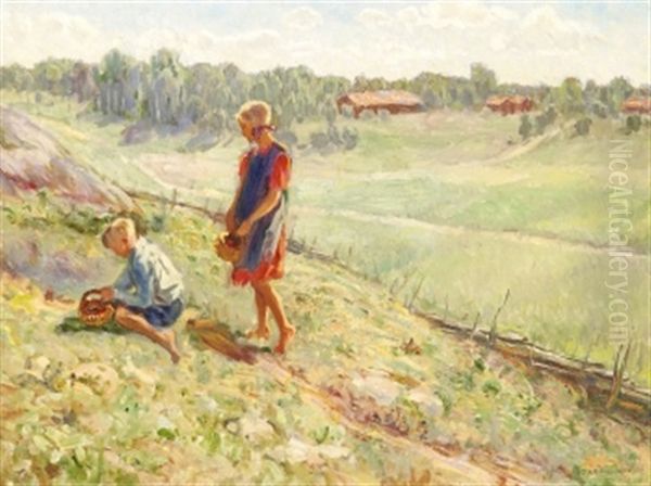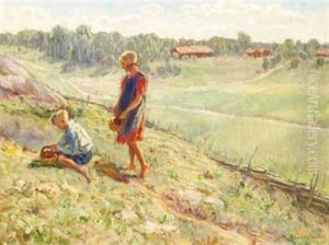 Gerda Wallander’s Barplockande Barn En Sommardag ("Berry-Picking Children on a Summer Day") is a charming example of early 20th-century Swedish genre painting, radiating nostalgia and bucolic tranquility. Rendered in Wallander’s signature delicate brushwork and soft, naturalistic palette, the scene captures children engrossed in gathering berries amid dappled sunlight, their white summer dresses and straw hats evoking an idyllic rural simplicity. Painted in 1912, the work reflects the lingering influence of Romanticism and the National Romantic movement in Sweden, which idealised folk life and nature. Though less internationally prominent than contemporaries like Carl Larsson, Wallander’s intimate portrayals of childhood occupy a significant niche in Scandinavian art history, bridging sentimental narrative painting and the emerging modernism of her era. The composition’s harmony of light and pastoral innocence exemplifies her skill in elevating everyday moments into poetic vignettes.