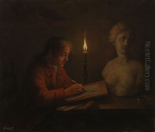 The painting Young Man Drawing by Dutch artist Gerhard Jan Palthe (1681–1757) captivates with its intimate yet lively portrayal of artistic creation. Rendered in the refined style of 18th-century Dutch portraiture, the work depicts a youthful artist absorbed in sketching, quill poised mid-stroke against a warm, softly lit backdrop. Palthe’s delicate brushwork and masterful chiaroscuro—hallmarks of Leiden’s artistic tradition—imbue the scene with quiet dignity, while the sitter’s relaxed posture and concentrated gaze suggest the intellectual vibrancy of the Enlightenment era. Though less renowned than contemporaries like Rembrandt or Vermeer, Palthe’s works represent an important bridge between Dutch Golden Age realism and the emerging Rococo sensibility. This particular painting stands out for its rare focus on the artist’s creative process, offering a meta-reflection on art-making itself.