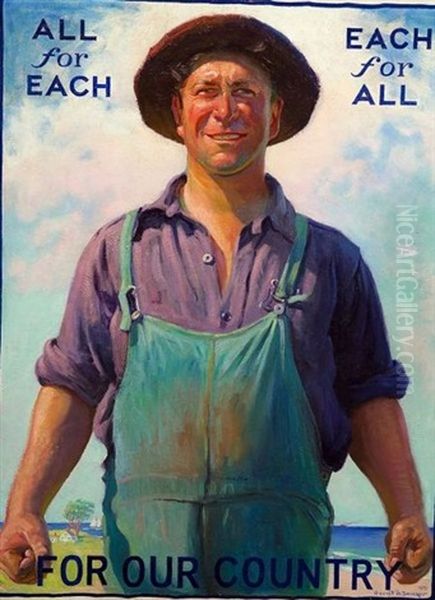 Gerrit Beneker's All For Each (1920) vividly captures the industrious spirit of early 20th-century American labor through bold realism and dynamic composition. The painting depicts a group of sturdy workers collaborating around machinery, their muscular forms bathed in dramatic factory lighting that casts striking shadows across riveted metal surfaces. Executed during Beneker's mature period documenting industrialization, it exemplifies his signature blend of social realism with modernist simplification – the angular figures nod to Precisionism while maintaining humanistic warmth. As part of America's interwar "machine aesthetic" movement, the artwork holds historical significance for bridging Ashcan School grit with streamlined Deco futurism, particularly in its celebration of proletarian solidarity during the Machine Age. The dramatic play of amber and slate hues against the workers' navy overalls creates visual tension that's simultaneously heroic and documentary.