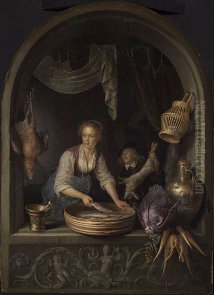 The luminous painting Girl in a Window by Gerrit Dou, one of Rembrandt’s most distinguished pupils, captures an intimate moment bathed in soft golden light. A young woman leans against a stone windowsill, her delicate features illuminated against the darkened interior, her gaze subtly directed outward as though inviting quiet contemplation. Dou’s impeccable rendering of textures—the roughness of the sill, the glint of her earring, the intricate folds of her sleeve—showcases his mastery of the Dutch fijnschilder ("fine painter") technique, characterized by almost microscopic precision. Created in the Dutch Golden Age, this work exemplifies genre painting’s transition from symbolic narratives to serene, everyday beauty. Its delicate interplay of shadow and light reflects the influence of his mentor, yet Dou’s refined polish earned him international acclaim, making him one of the most sought-after artists of his time.
