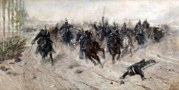 Giovanni Fattori’s Cavalry Charge is a dynamic masterpiece of the 19th-century Italian Macchiaioli movement, capturing the raw energy and chaos of combat with striking immediacy. Painted between 1880–1890, the work exemplifies Fattori’s signature "macchia" (spot) technique, using bold brushstrokes and contrasting patches of light and shadow to evoke movement and emotion. Set against a dusty, sunlit battlefield, the charging cavalrymen—rendered with loose yet precise strokes—convey both the grandeur and brutality of war, reflecting Italy’s Napoleonic-era military history. As a leading figure of the Macchiaioli, often considered Italy’s answer to French Impressionism, Fattori broke from academic traditions, emphasizing realism and atmospheric depth. This painting stands as a pivotal work in European art history, bridging Romanticism’s dramatism and Modernism’s innovative techniques.