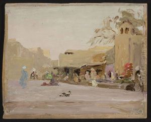 Giulio Rosati’s Mercanti Di Schiave (Slave Traders) is a striking Orientalist painting that immerses viewers in a dramatic scene of 19th-century Middle Eastern market life. Rosati, an Italian artist known for his meticulous Academic style, captures the opulence and tension of the subject with vivid detail—rich fabrics, intricate architecture, and expressive figures. The painting reflects the European fascination with "exotic" cultures during the colonial era, though its romanticized depiction of slavery has drawn modern critique for perpetuating problematic stereotypes. Art historically, Rosati’s work exemplifies the Orientalist genre’s blend of fantasy and realism, showcasing his mastery of composition and texture while also highlighting the era’s cultural biases. Though not as widely reproduced as some Orientalist works, Mercanti Di Schiave remains a notable example of Rosati’s technical skill and the genre’s complex legacy.