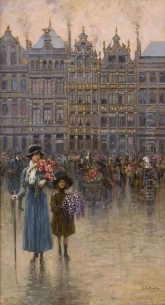 Giuseppe De Sanctis' The Flower Market in Brussels captures the vibrant pulse of 19th-century urban life with remarkable warmth. Painted in 1881, this oil on canvas immerses viewers in a sun-dappled Brussels square, where flower vendors arrange blossoms in riotous bursts of pink, crimson, and gold while elegantly dressed townsfolk peruse the wares. The Italian artist’s academic training shines through in the precise rendering of fabrics and botanicals, yet his loose brushwork in the architectural details channels the emerging plein-air spontaneity. As a prime example of European genre painting during the Belle Époque, it bridges Romanticism’s lyricism and Impressionism’s fleeting light—De Sanctis’ meticulous human vignettes predate Sorolla’s luminous crowds by decades. The work gained acclaim at Paris Salons for its rare balance of documentary charm and painterly flourish, cementing his reputation as a transalpine observer of modern life.