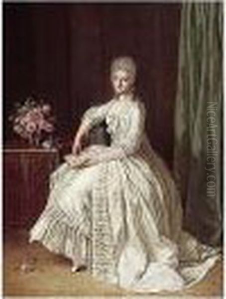The portrait Portrait Of A Lady, Full Length, Seated Beside A Cabinet With A Vase Of Roses On Top, Holding A Book by Guillaume Martin exudes an air of refined elegance and quiet contemplation. Painted in the late 19th or early 20th century, it reflects the academic realism prevalent in European portraiture of the period, with meticulous attention to texture, fabric, and interior detail. The subject, a poised woman dressed in sumptuous attire, gazes gently at the viewer while holding a book—a symbol of intellect and leisure. The cabinet, adorned with a vase of roses, adds a delicate floral note, enhancing the composition’s harmony. Martin’s work echoes the influence of French Salon painting, though his style remains distinct in its subdued yet intimate atmosphere. While not as widely recognized as his contemporaries, this painting offers a glimpse into bourgeois domesticity and artistic conventions of the era, making it a valuable piece for collectors and scholars alike.